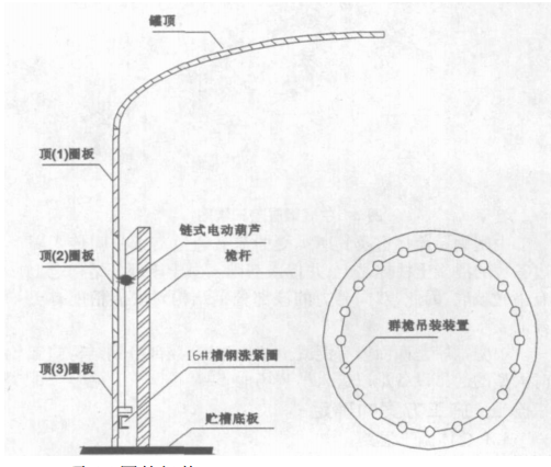 在壁板內側一周均布20根桅桿,并安裝上鏈式電動葫蘆如圖所示:桅桿頂應設有系桿,桅桿之間應設10組剪刀叉支撐均布,以保證群桅裝置的穩定性。