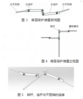 經(jīng)分析,升降機所用停層保護裝置為轎廂左、右兩 側(cè)的平層銷。該平層銷采用一套連桿裝置,通過轉(zhuǎn)桿的 轉(zhuǎn)動帶動左、右兩側(cè)的連桿,再由連桿帶動兩側(cè)的平層銷伸出或收回(圖 3、圖 4)。